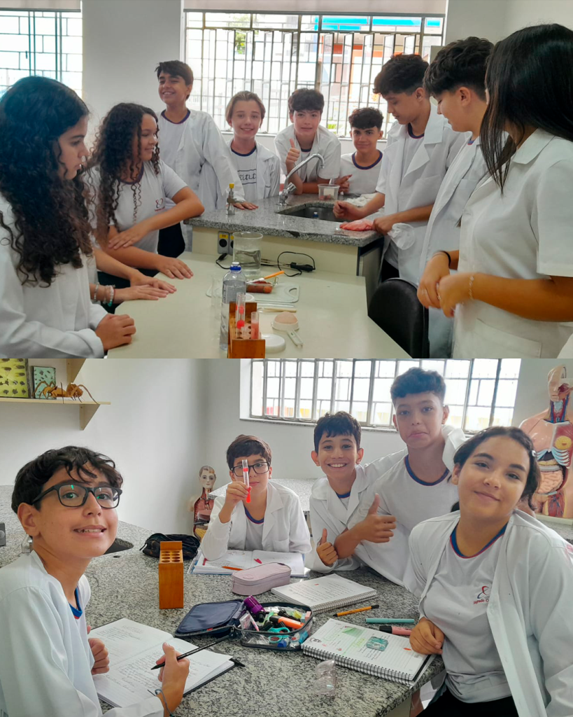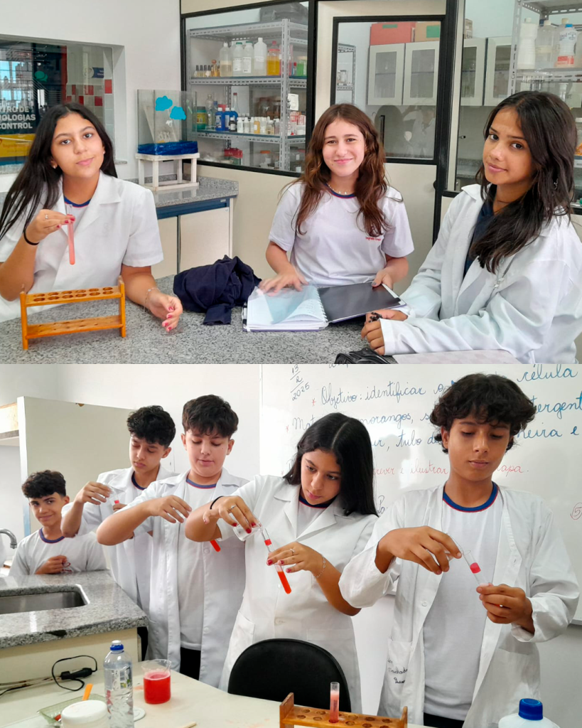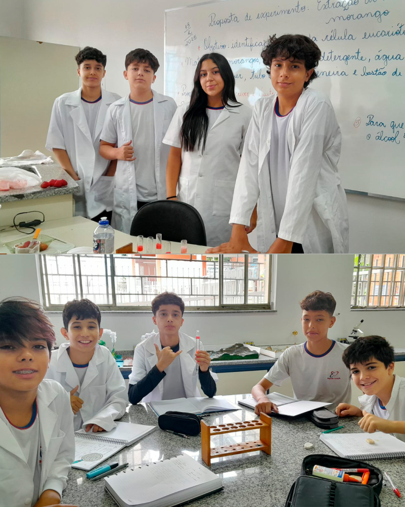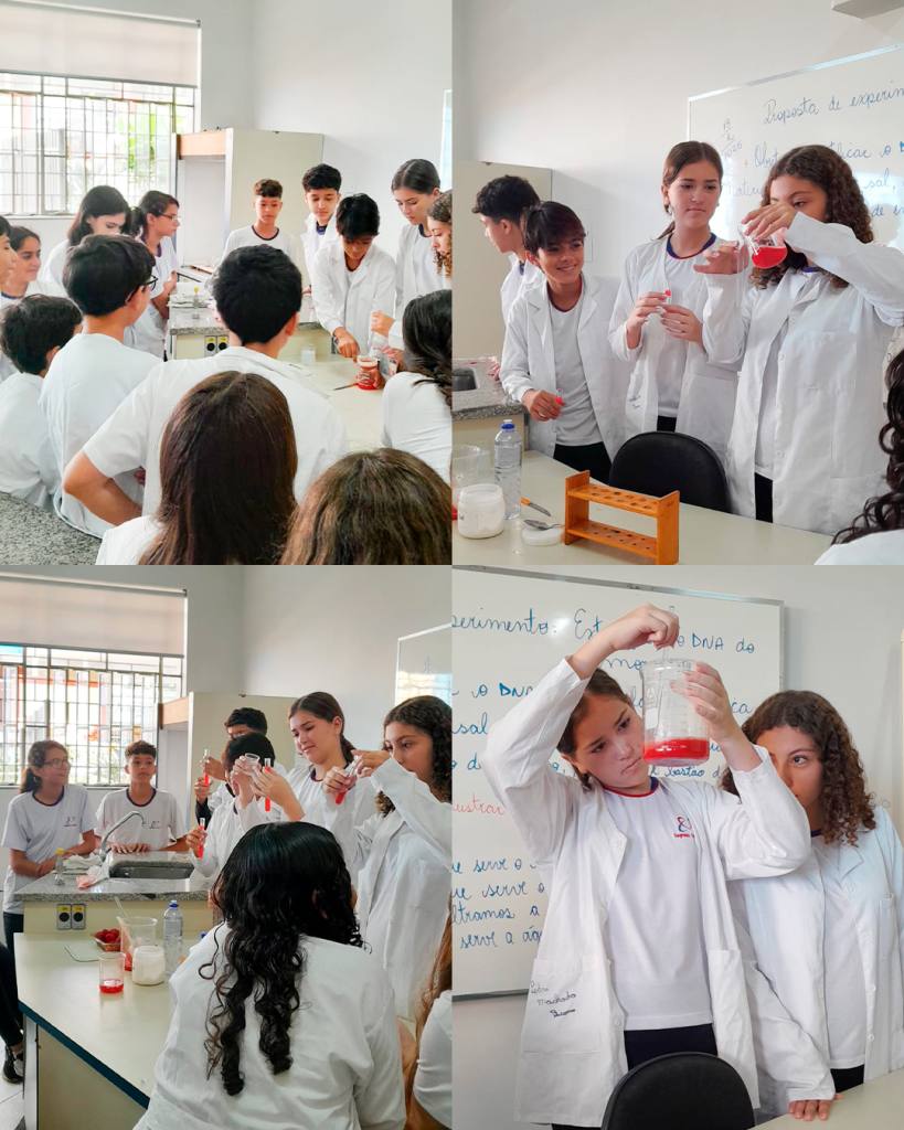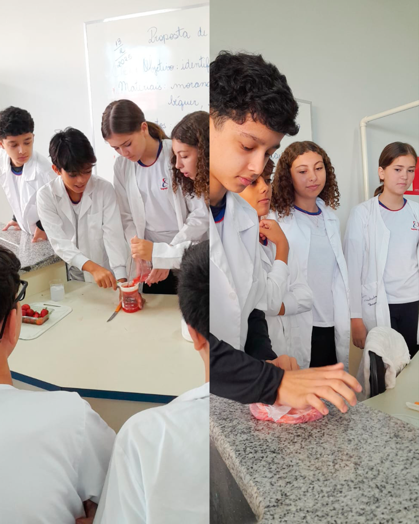 No laboratório de Ciências, os alunos realizaram a extração do DNA do morango com o objetivo de visualizar, a olho nu, a estrutura molecular que contém as informações genéticas dos seres vivos. Uma experiência incrível para conectar teoria e prática, no INSSC !