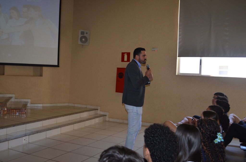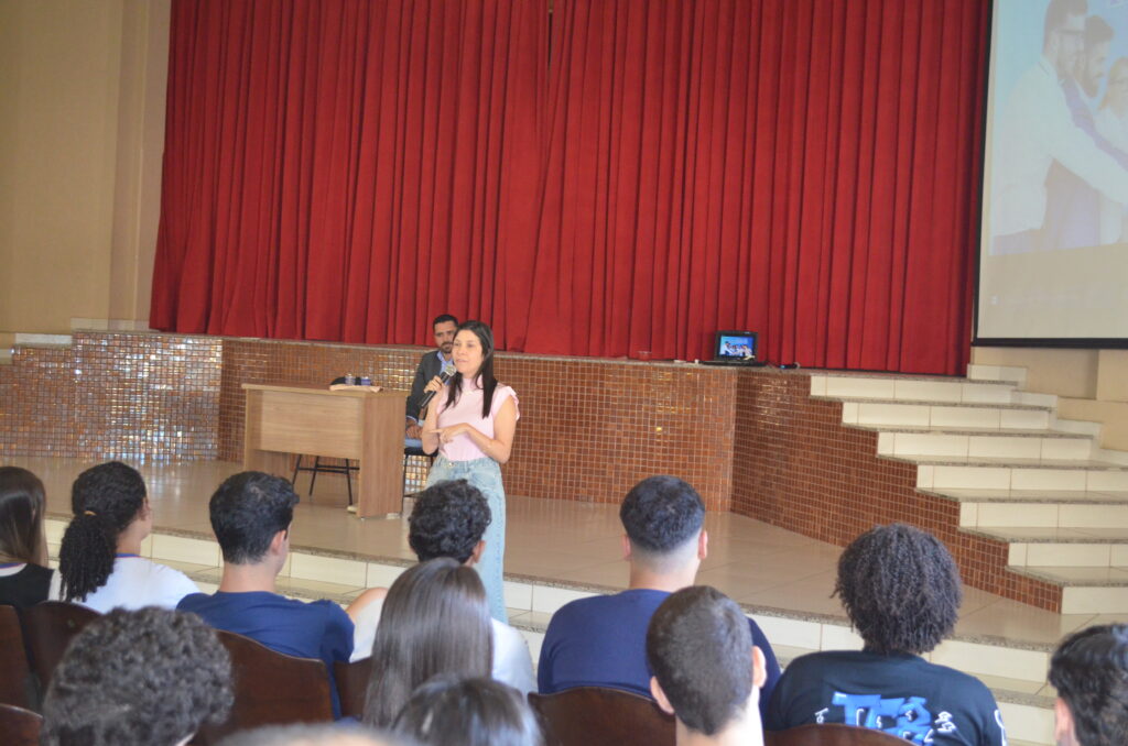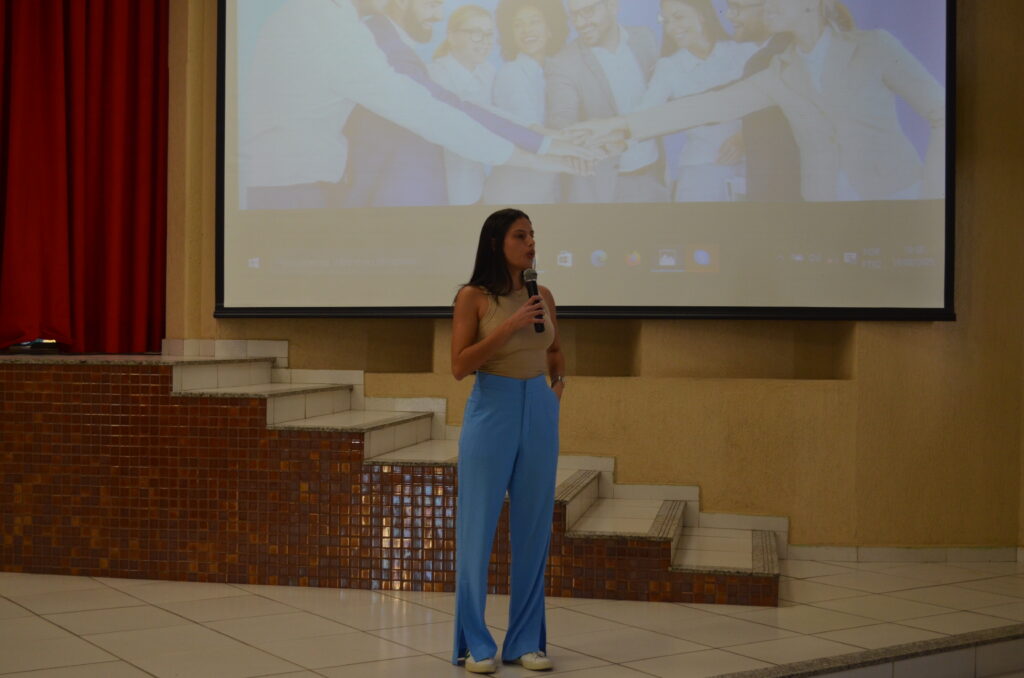 Rhaissa, graduada em Psicologia pela UFLA, atualmente atua como psicóloga comportamental. Durante seu encontro com os alunos, ela discutiu a importância da saúde mental e o impacto positivo que a psicologia pode ter na vida das pessoas.